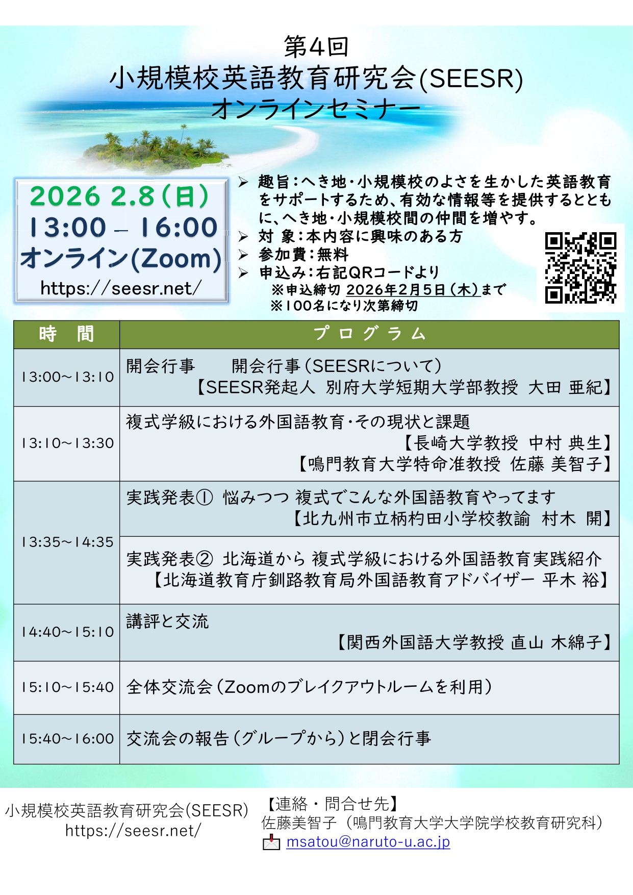 第4回 SEESRオンラインセミナー開催決定 今回は複式での外国語教育にフォーカスしたセミナーです。多数のご参加お待ちしております。【詳細】日時: 2月8日(日)13:00〜16:00(ZOOM)趣 旨: へき地・小規模 […] -